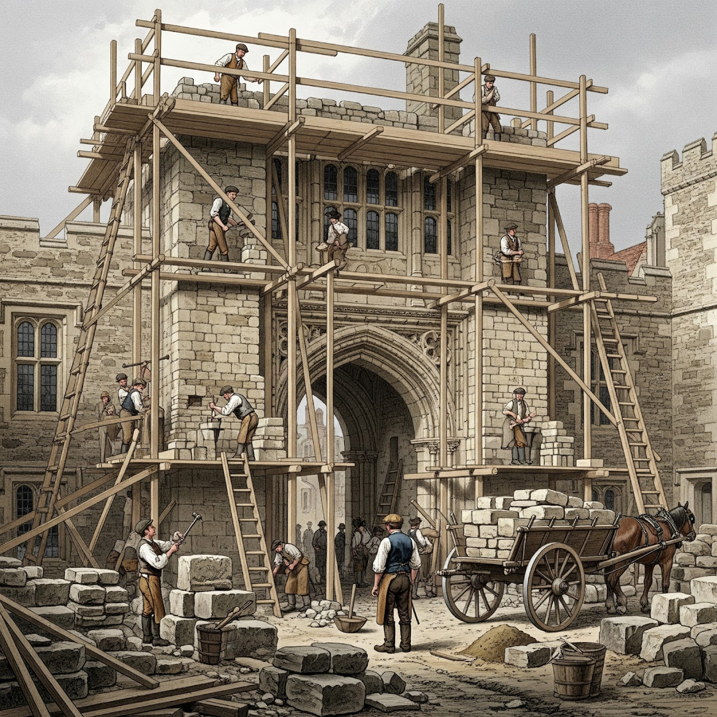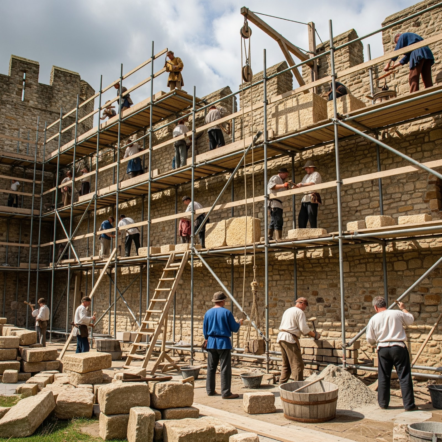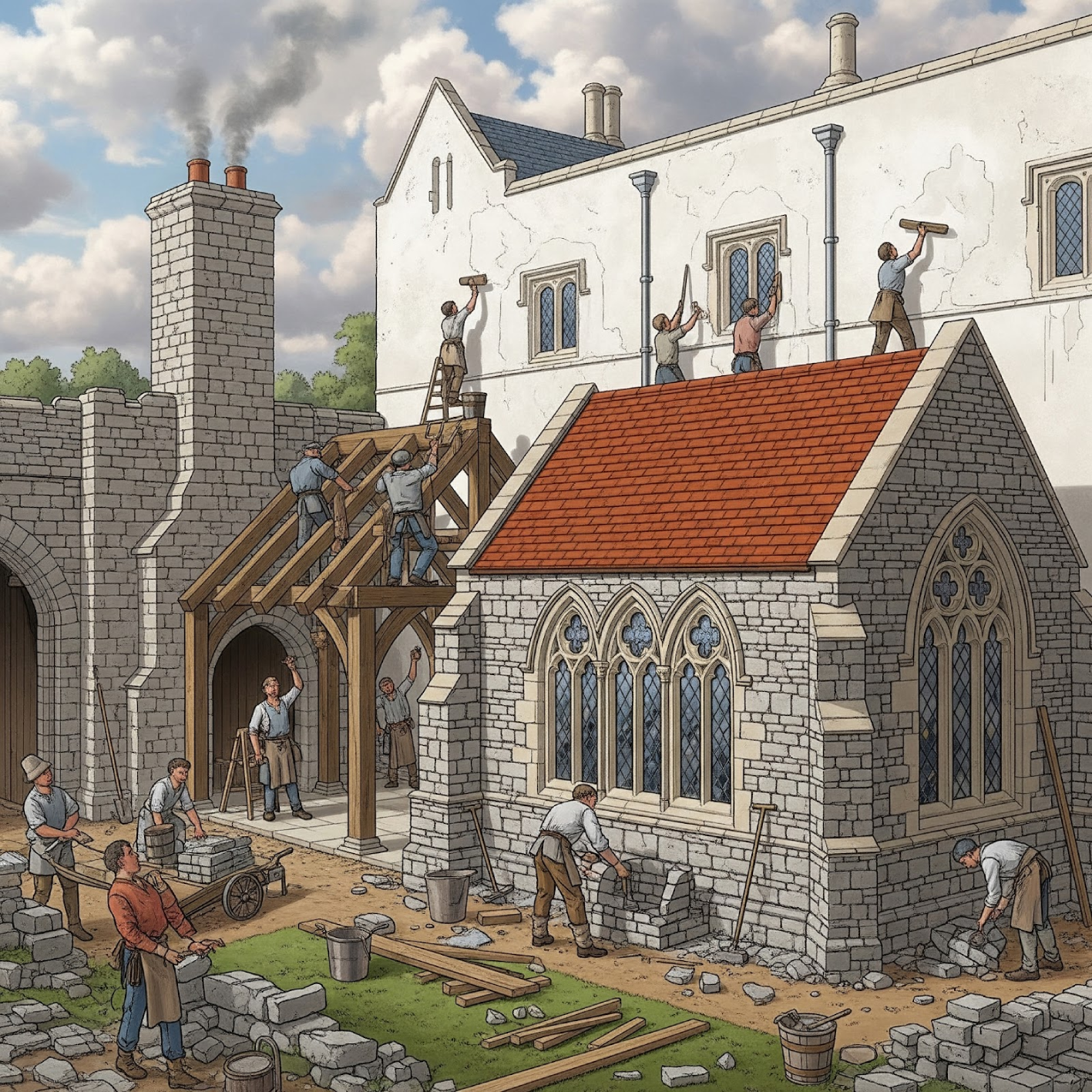 The Great Chapel and the King’s two great chambers are pargeted and whitewashed. A chimney is inserted in the chamber by the gate. In the following year a new chapel and chamber are built, with a passageway connecting the chapel to the hall. It has stone walls, a tiled roof, and three glazed windows.